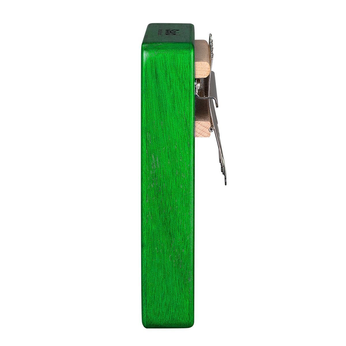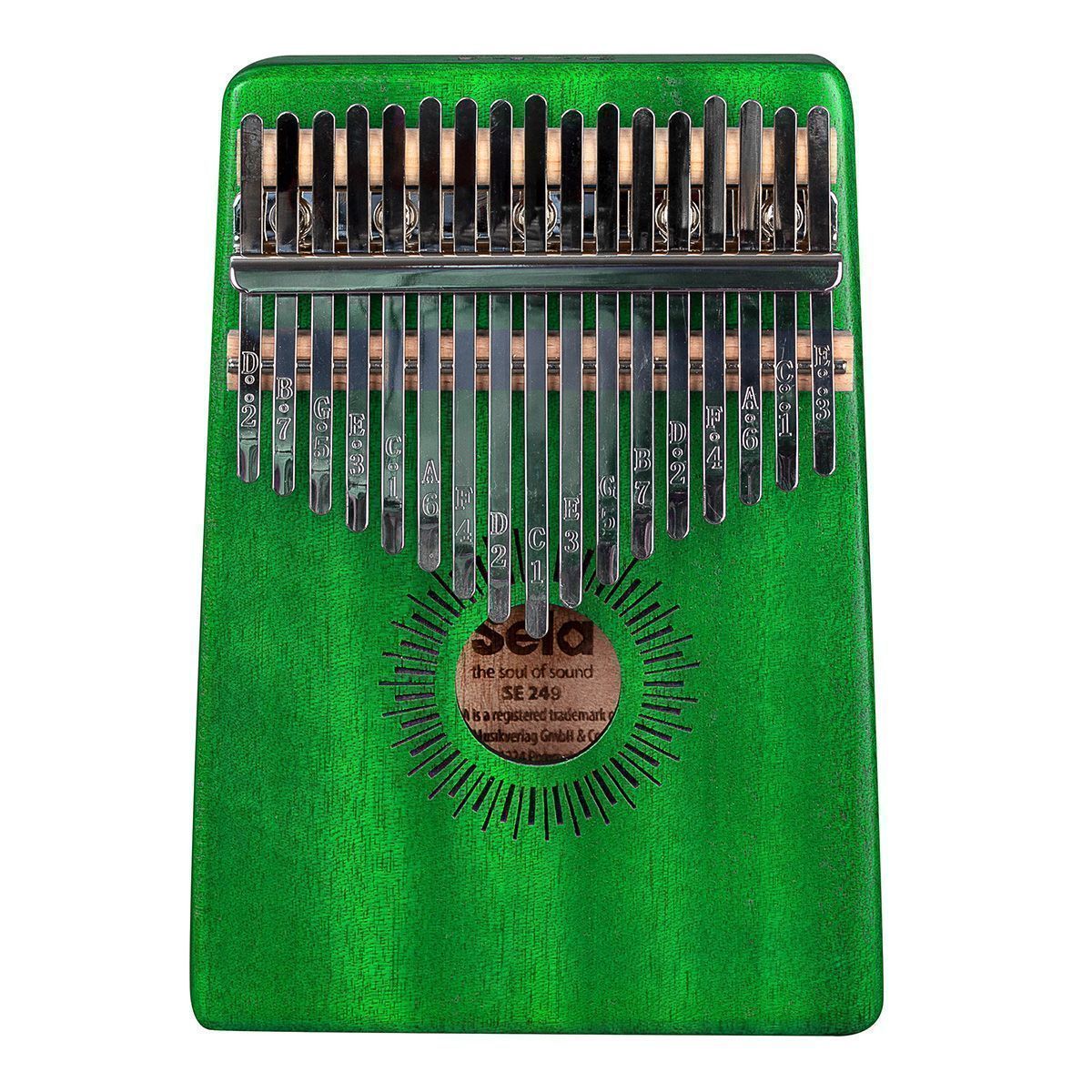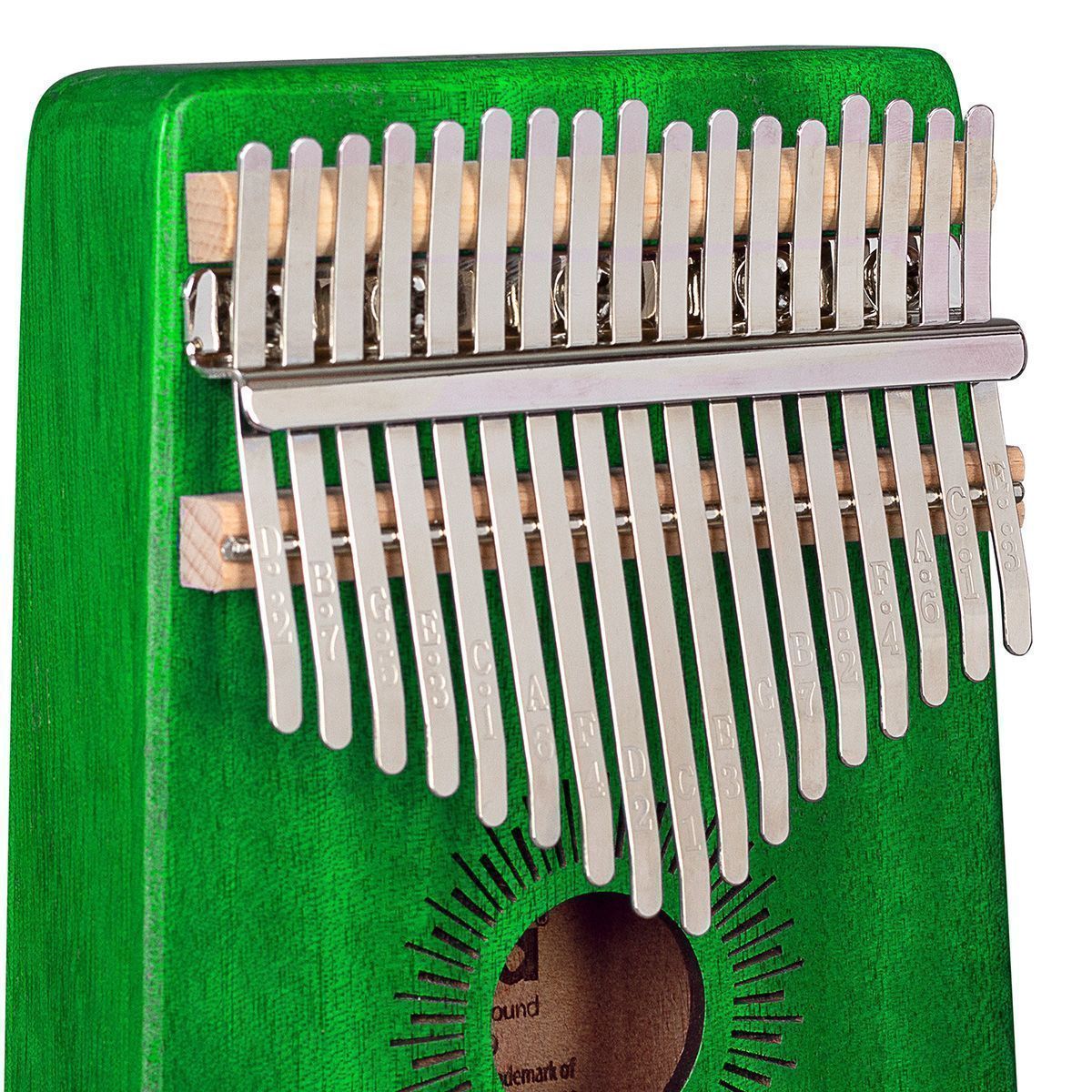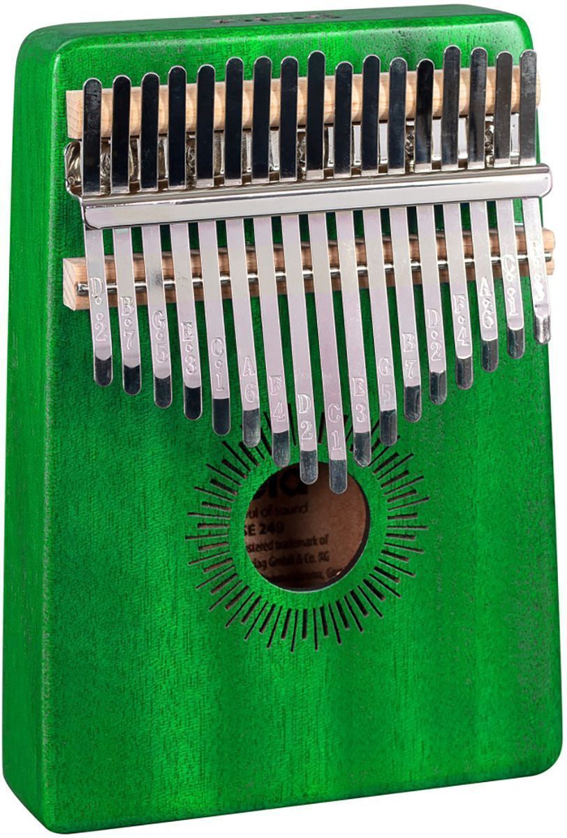 Калимба изготовлена из высококачественного красного дерева. Корпус усиливает низкие частоты и, таким образом, производит полный, чистый и теплый звук с завораживающим резонансом. Высококачественные металлические язычки настроены в до мажоре и имеют диапазон от c' - e''' (C4 - E6). Обозначение нот на язычках делают калимбу подходящей как для начинающих, так и для опытных музыкантов.